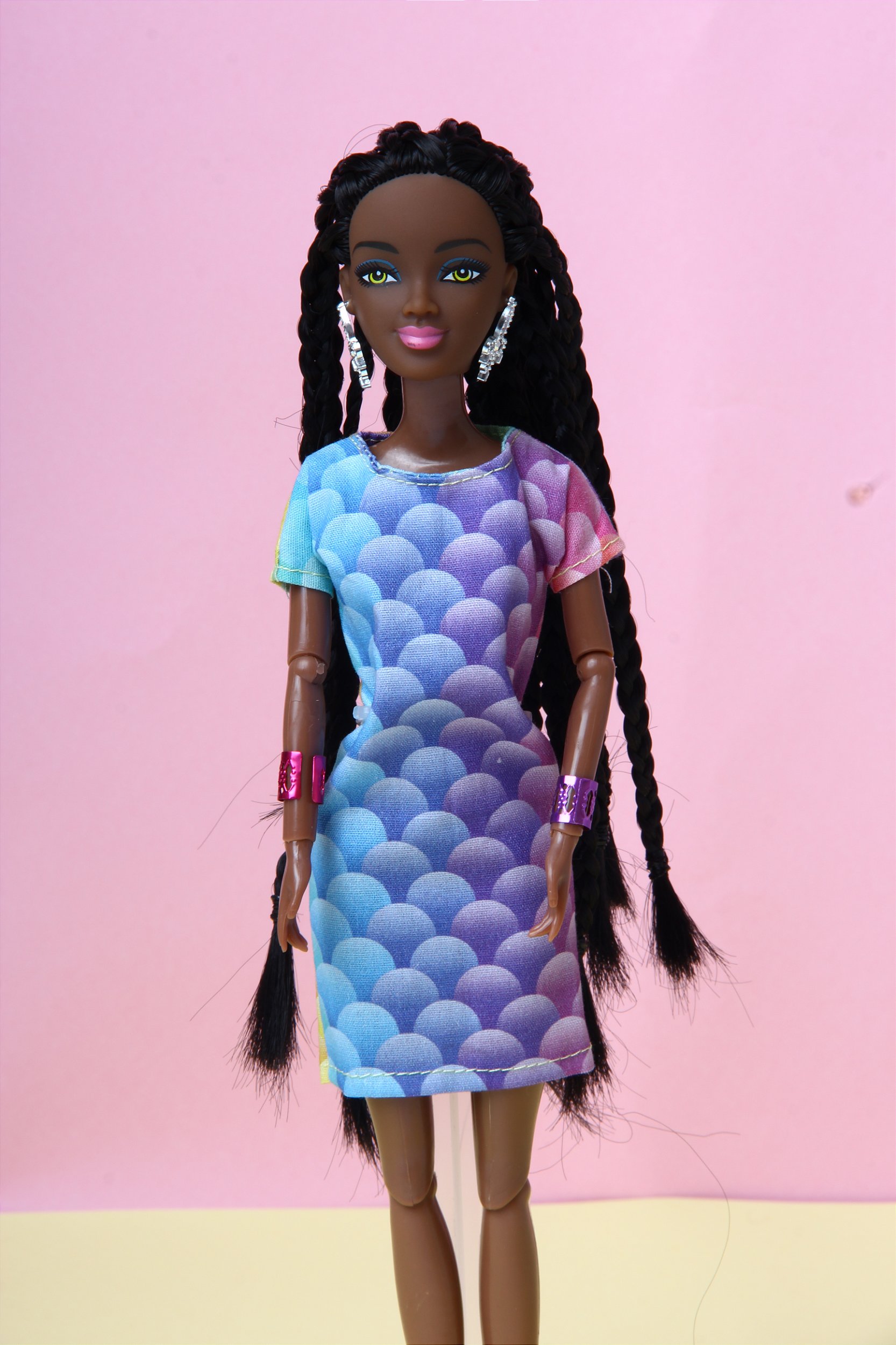 A Aneesa Color Trança tem um look sensacional, camiseta oversize com tecido de escamas de sereia e com um lindo cabelo com box braids.
