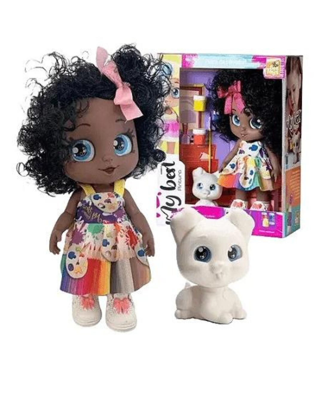 A Boneca My Best Pintura tem a temática de pintura e vem acompanhada por um kit pintura e seu pet. Produzida em vinil macio e atóxico com articulações nos membros vem com guaches e um pincel para a criança pintar o pet da maneira que quiser.